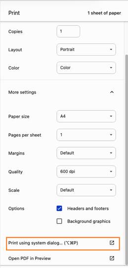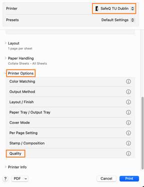 File > Print (or press ⌘ + P) > Destination: SafeQ TU Dublin > More settings > Print using system dialog > Printer Options > Quality > Select Color: Auto Color