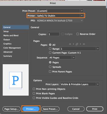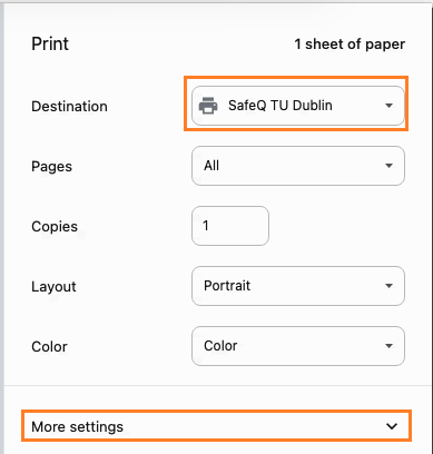File > Print (or press ⌘ + P) > Printer: SafeQ TU Dublin > Printer Options > Make required changes example: Quality > Select Color: Auto Color for 1-Sided print Layout / Finish > Print Type: 1-Sided