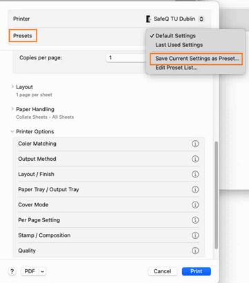 To Select Preset, File > Print (or press ⌘ + P) > Printer: SafeQ TU Dublin > Presets > Choose required preset